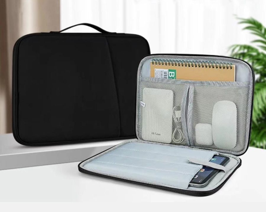 内側には複数のポケットやメッシュ収納が付いており、充電器やケーブル、ノートなどの小物を整理して持ち運べます。