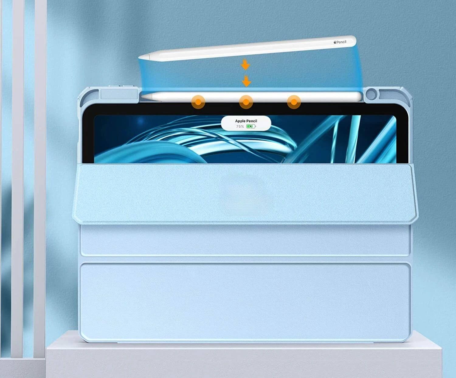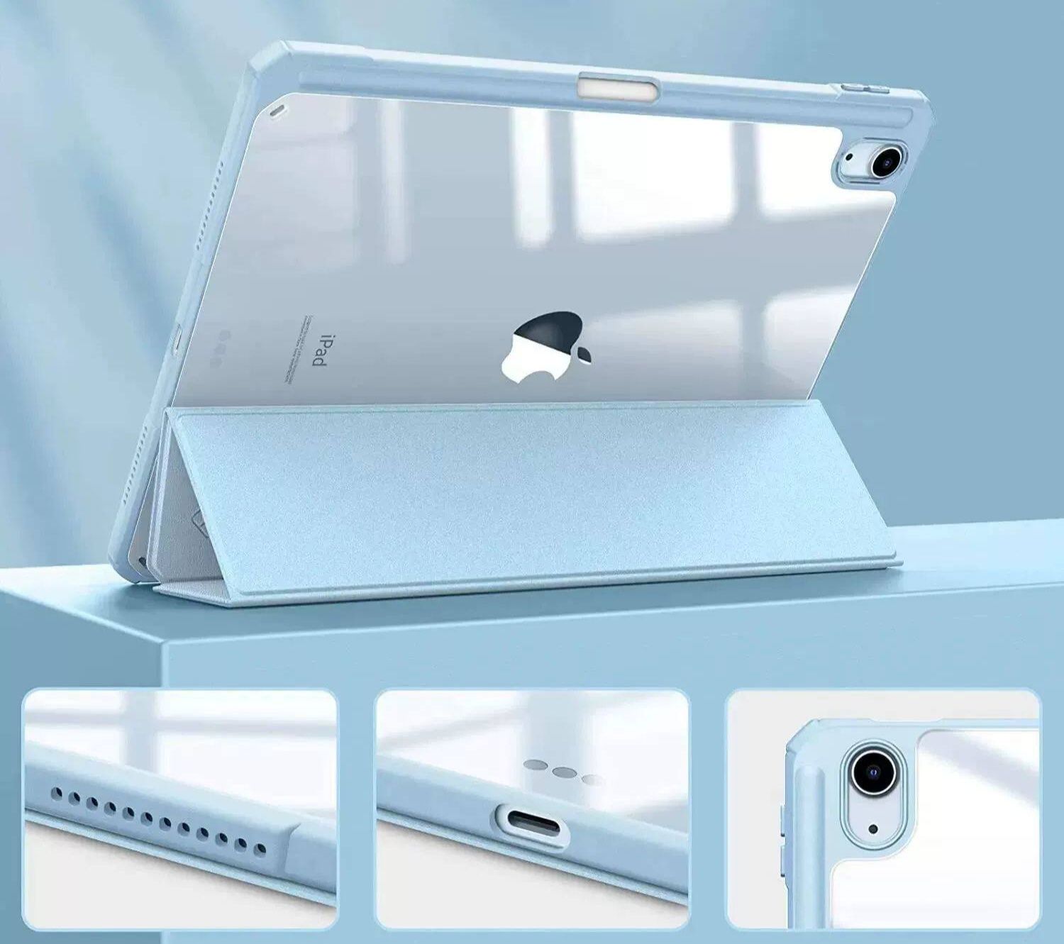 本体のデザインを活かせる透明背面が魅力のipadカバーです。 三つ折り構造で動画視聴や作業に便利なスタンド機能を搭載したiPad Pro ケースとなっております。 硬質クリア素材が傷や衝撃から大切な端末を守ります。 カメラ部分もしっかり保護し、各種ボタンや端子へのアクセスも快適です。 持ち運びにも便利な薄型軽量設計で毎日の使用に最適なケースです。