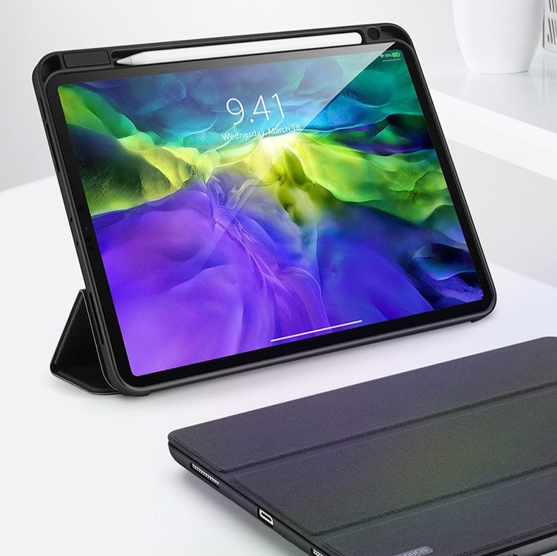 大切な端末をしっかり守るiPad Pro ケースです。 三つ折り構造で複数の角度調整が可能なスタンド機能を搭載し、動画視聴や読書、作業など様々なシーンで快適にお使いいただけます。 背面と前面を全面的に保護する設計で、傷や衝撃からしっかりガードします。 ペンシル収納スペース付きで機能性も抜群のipadカバーです。 マグネット式開閉でスリープ機能にも対応し、日常使いに最適な一品です。